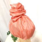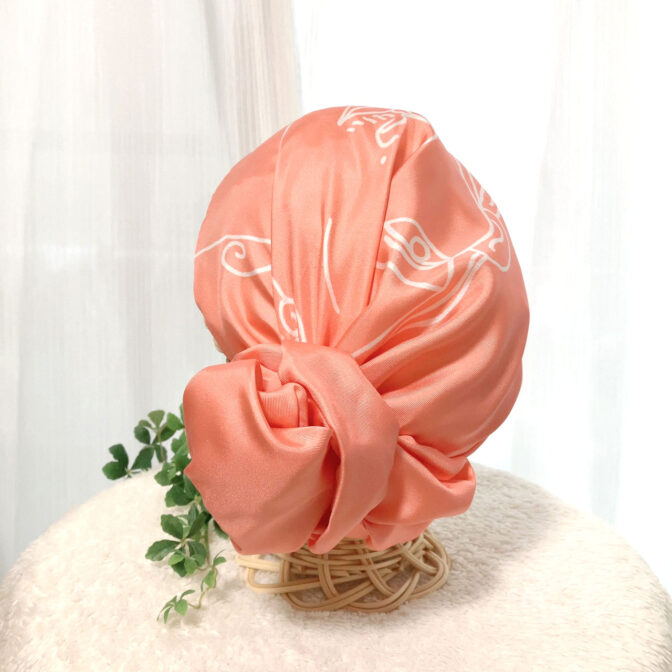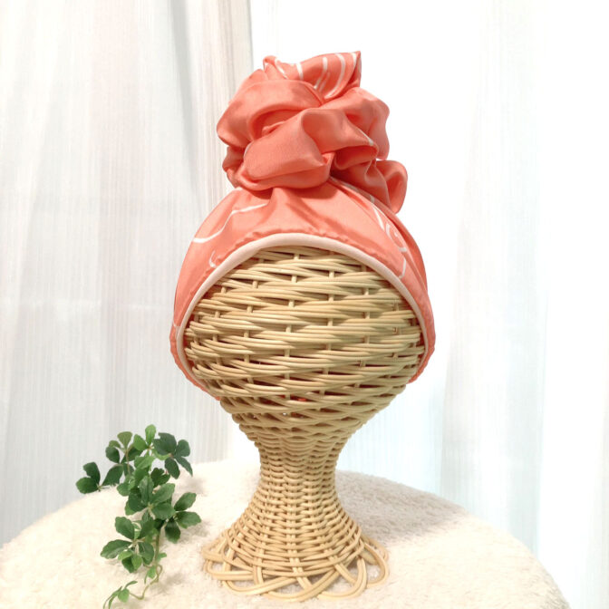 頭全体を包み込むデザインで、スカーフ襟足箇所のゴムギャザーで安定したフィット感です。