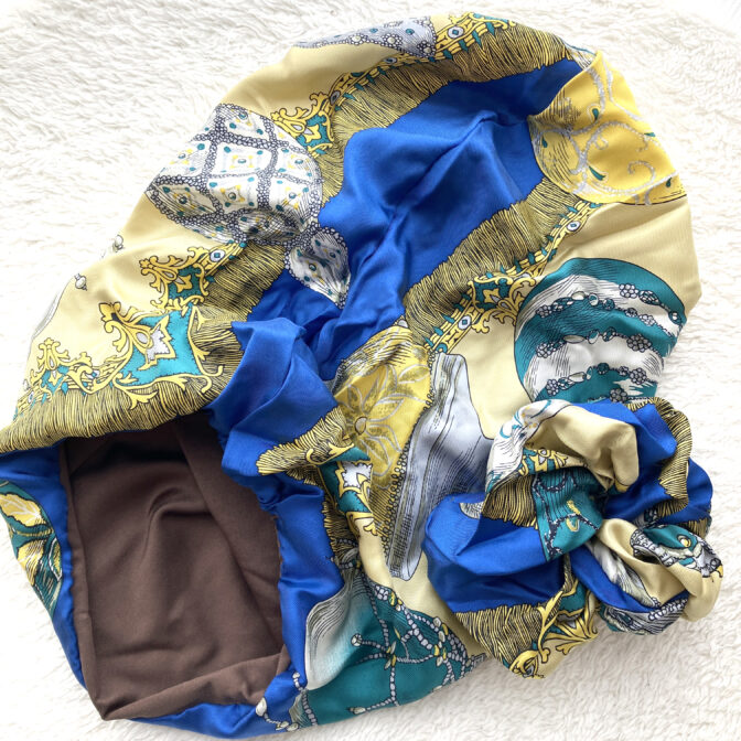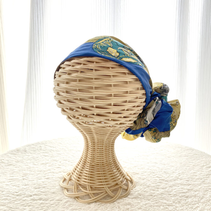 頭全体を包み込むデザインで、スカーフ襟足箇所のゴムギャザーで安定したフィット感です。
