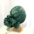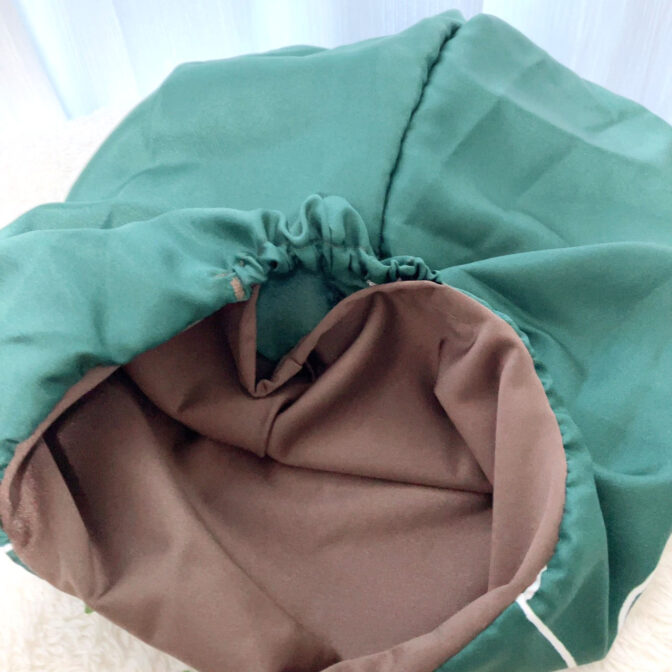 頭全体を包み込むデザインで、スカーフ襟足箇所のゴムギャザーで安定したフィット感です。