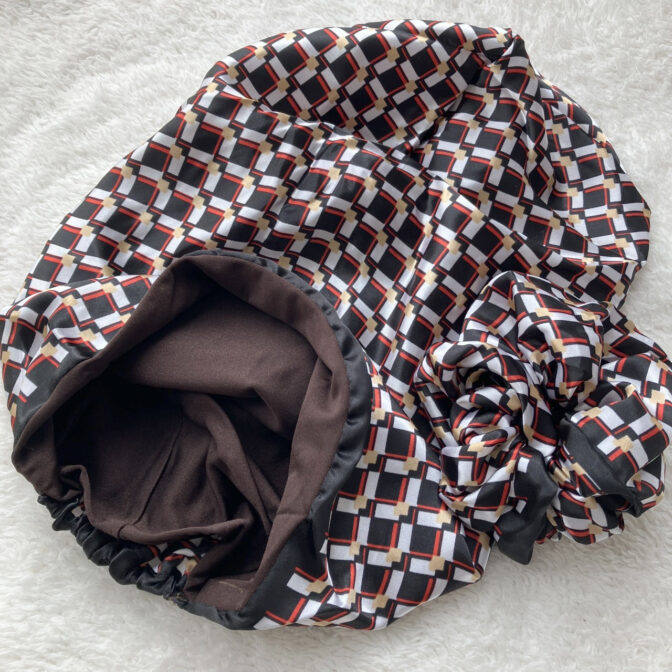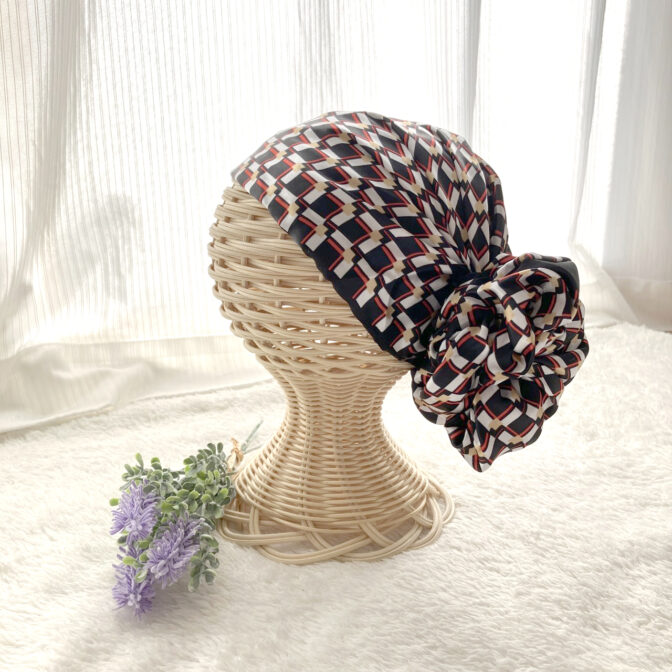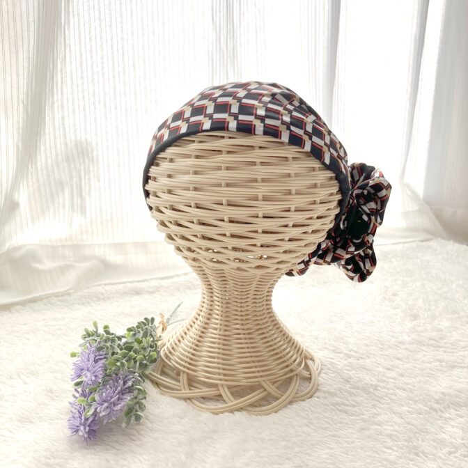 頭全体を包み込むデザインは、スカーフ襟足箇所のゴムギャザーで安定したフィット感◎シュシュを使って纏めリボンを作るので、装着は簡単!早い!キレイに仕上がります。