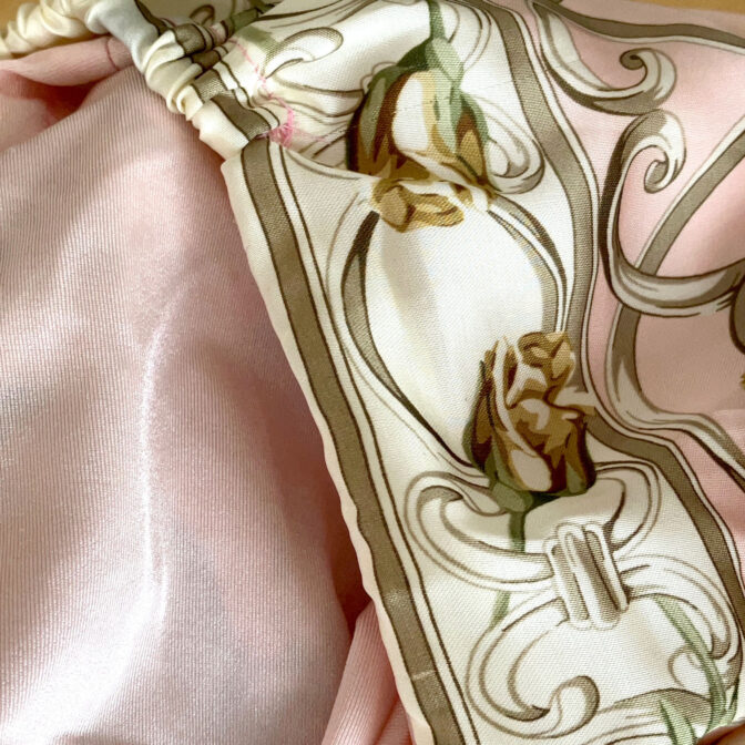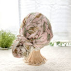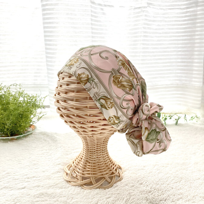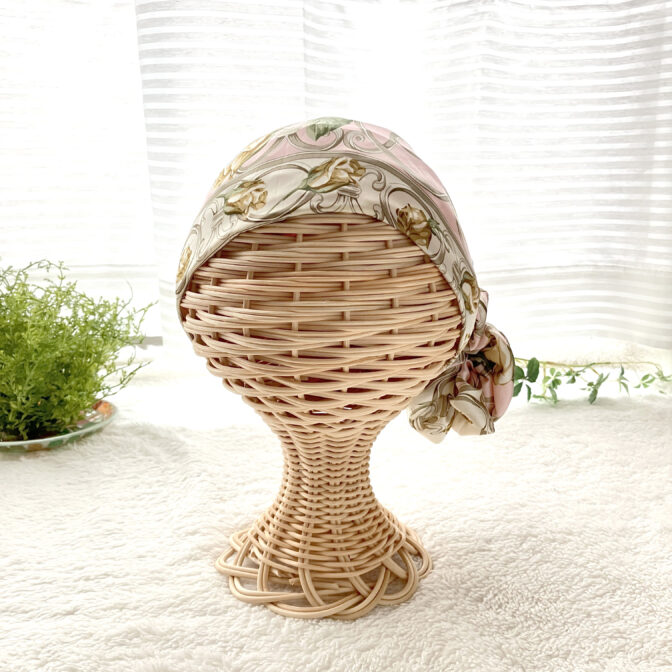 頭全体を包み込むデザインで、スカーフ襟足箇所のゴムギャザーで安定したフィット感です。