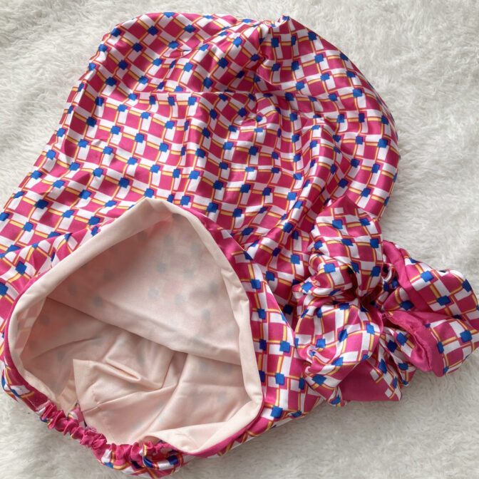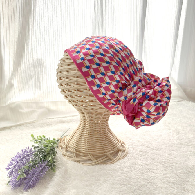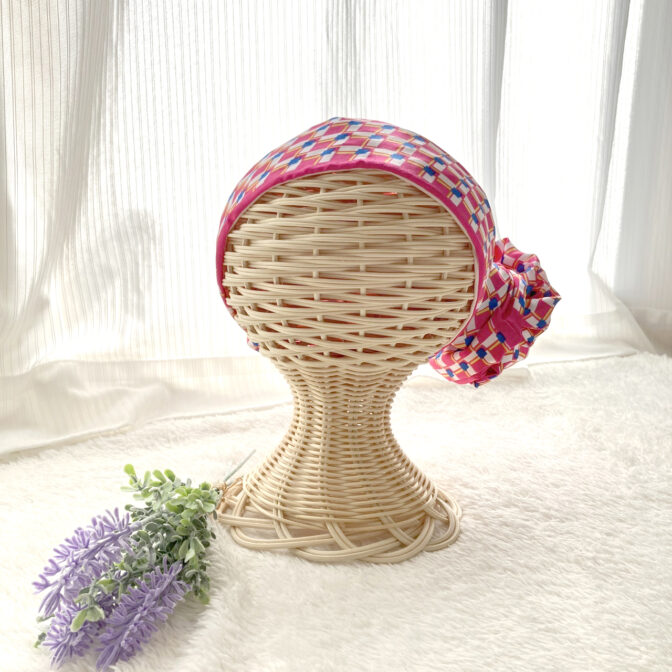 頭全体を包み込むデザインは、スカーフ襟足箇所のゴムギャザーで安定したフィット感◎シュシュを使って纏めリボンを作るので、装着は簡単!早い!キレイに仕上がります。