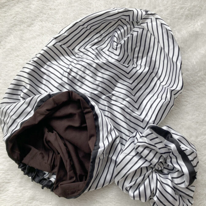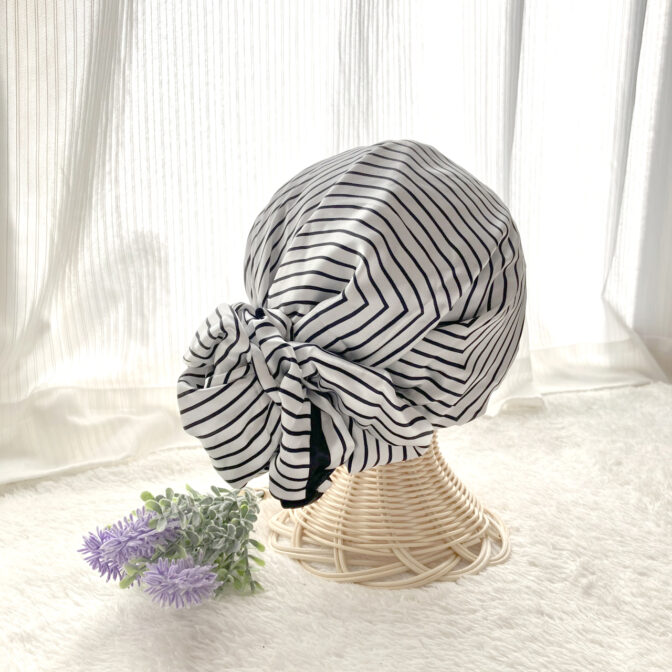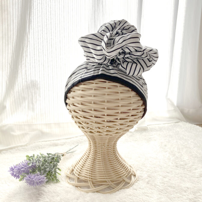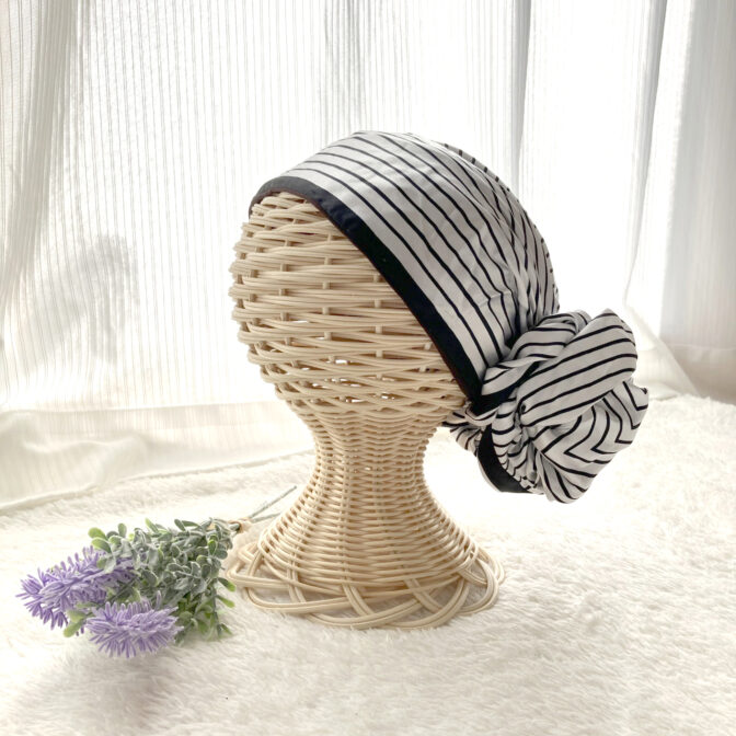 頭全体を包み込むデザインは、スカーフ襟足箇所のゴムギャザーで安定したフィット感◎シュシュを使って纏めリボンを作るので、装着は簡単!早い!キレイに仕上がります。