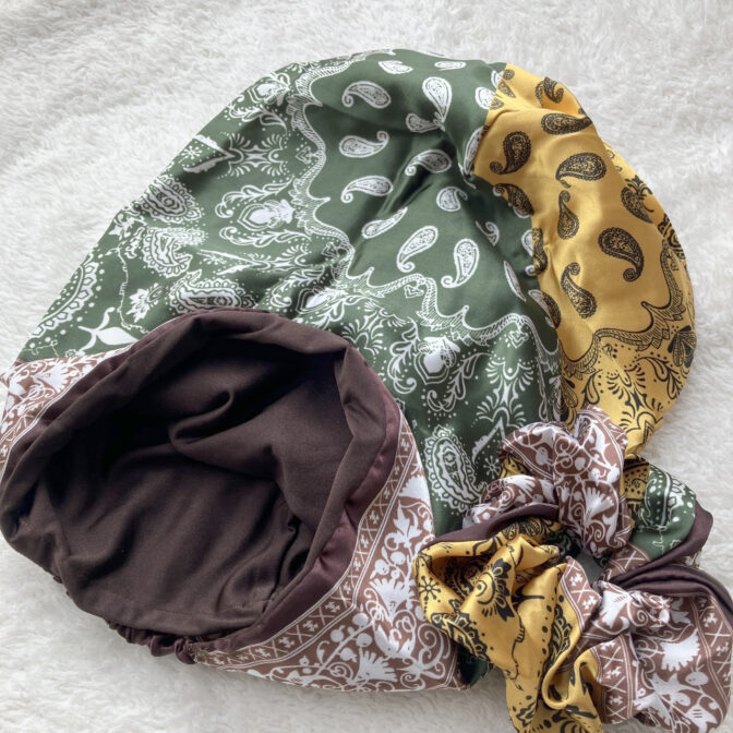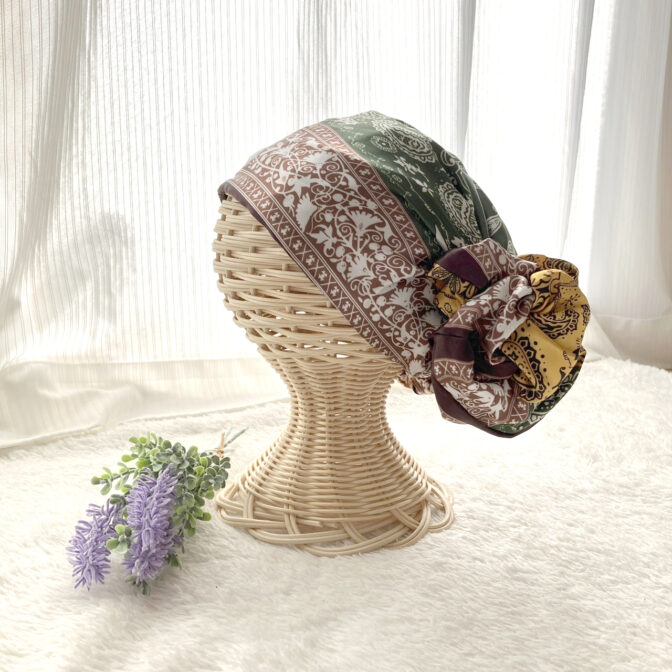 お子さま「ヘッドスカーフ」茶黄緑ペイズリー柄k-004★
