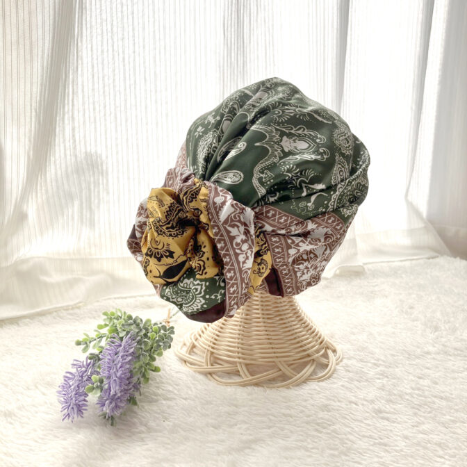 頭全体を包み込むデザインは、スカーフ襟足箇所のゴムギャザーで安定したフィット感◎シュシュを使って纏めリボンを作るので、装着は簡単!早い!キレイに仕上がります。