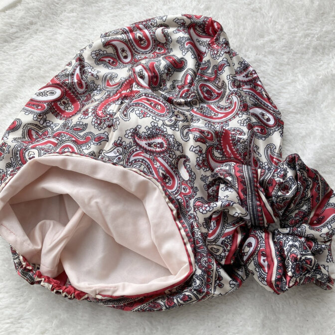 頭全体を包み込むデザインは、スカーフ襟足箇所のゴムギャザーで安定したフィット感◎シュシュを使って纏めリボンを作るので、装着は簡単!早い!キレイに仕上がります。