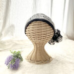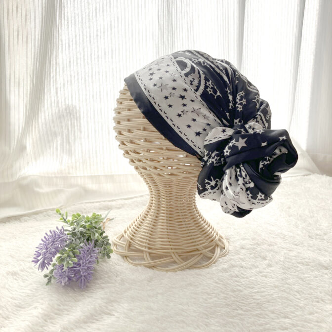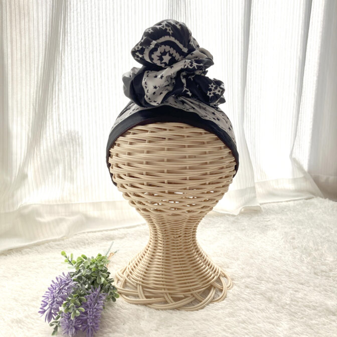頭全体を包み込むデザインは、スカーフ襟足箇所のゴムギャザーで安定したフィット感◎シュシュを使って纏めリボンを作るので、装着は簡単!早い!キレイに仕上がります。