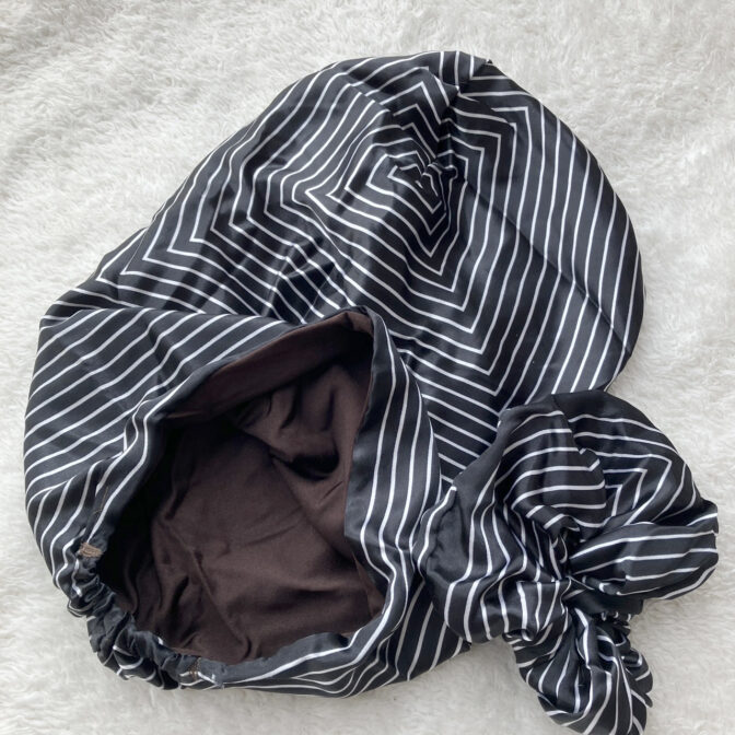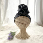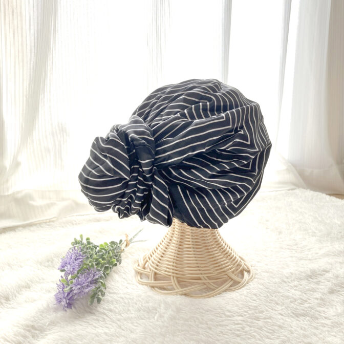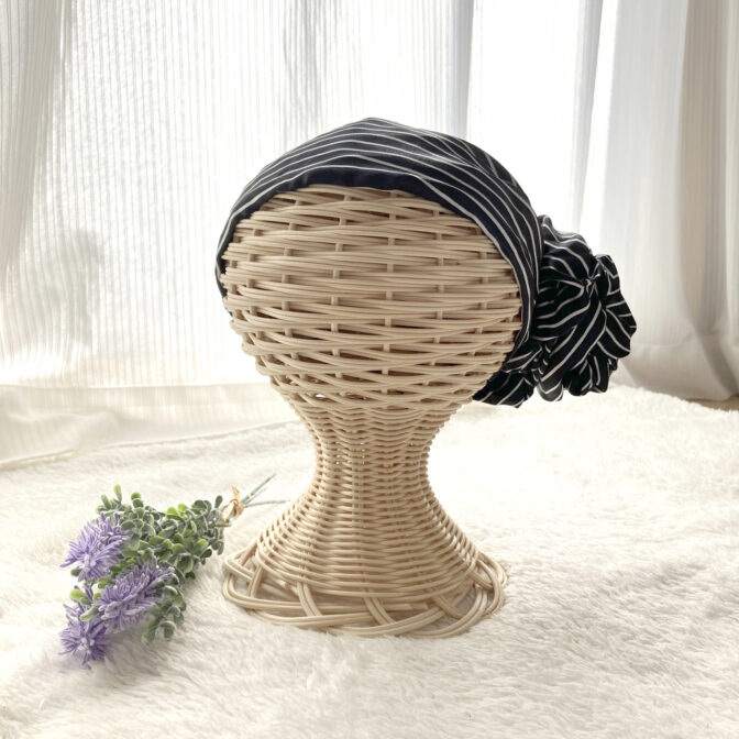 頭全体を包み込むデザインは、スカーフ襟足箇所のゴムギャザーで安定したフィット感◎シュシュを使って纏めリボンを作るので、装着は簡単!早い!キレイに仕上がります。