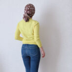 頭全体を包み込むデザインで、スカーフ襟足箇所のゴムギャザーで安定したフィット感です。