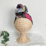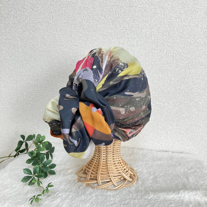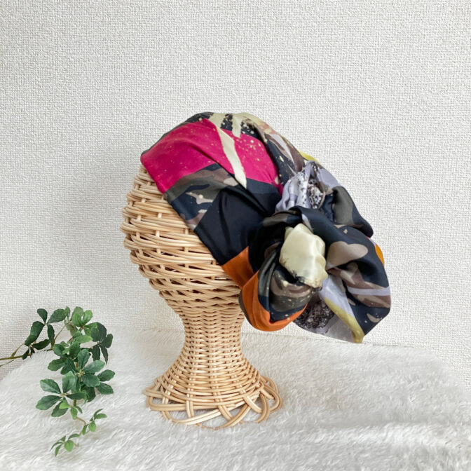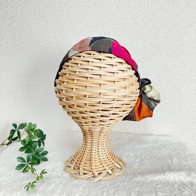 頭全体を包み込むデザインで、スカーフ襟足箇所のゴムギャザーで安定したフィット感です。